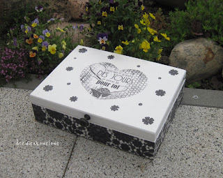 Szkatułkę ozdobiłam dodatkowo metalowymi okuciami i nóżkami. Wieczko wykonałam metodą na żelazko, pokryłam spękaniami i dodatkowo zrobiłam maleńkie złote kropeczki konturówką (na zdjęciach ledwo je widać).